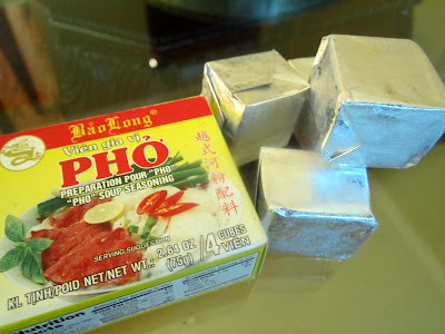 Faire chauffer l’eau dans une marmite avec le fond de boeuf, le cube à Pho, les feuilles de basilic thai ciselées finement (attention, rien à voir avec le basilic qu’on connait…), la badiane, les champignons noirs et le glutamate si vous en avez.